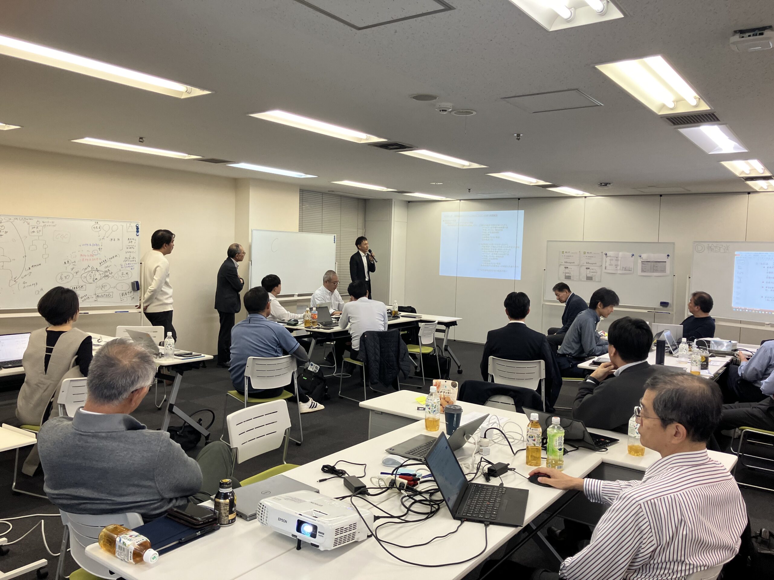8月会合にて学んだ「ワークデザインによる物流システムデザイン」をもとに、「デジタル技術を活用してどんなシステムをつくりたいか?」について、そのアイデアについてグループに分かれて検討をしました。また、検討結果について、グループ間で発表とディスカッションを実施しました。
