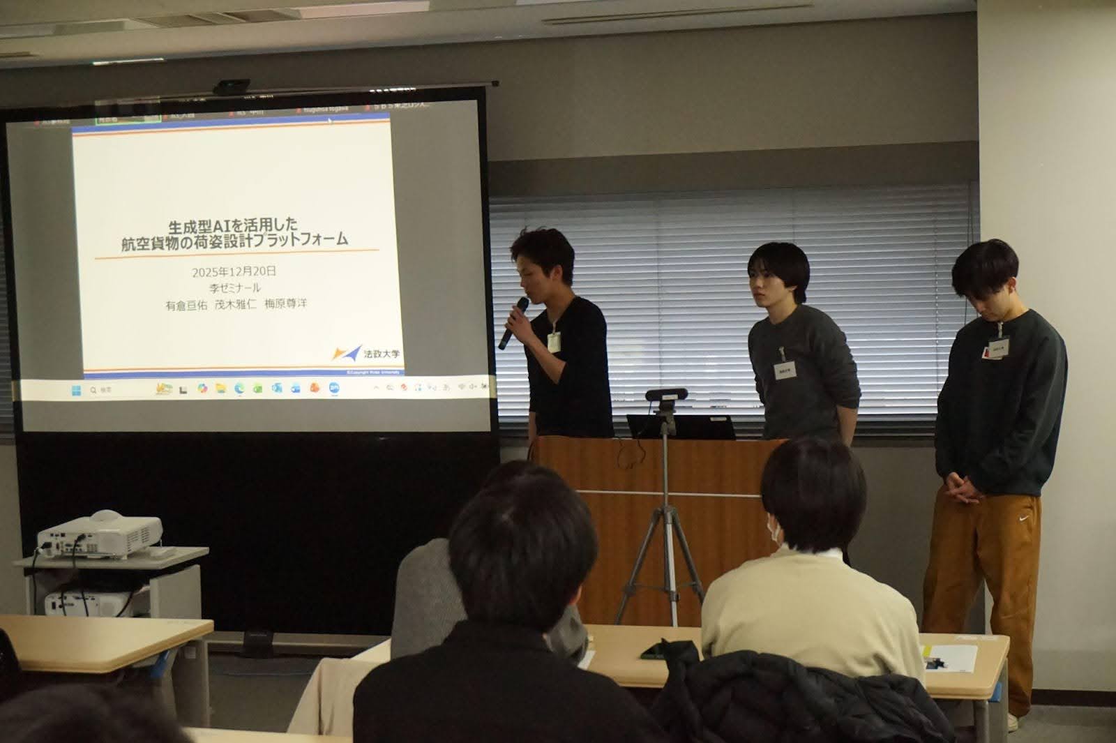 法政大学の「チーム3」は、AIを活用した航空貨物の荷姿設計プラットフォームについて発表を行いました。