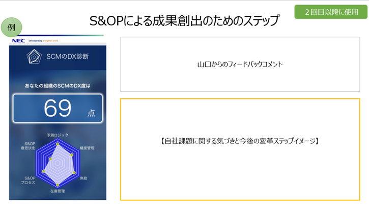 ・自社のプロジェクト推進計画の業界一般との差、留意点をアドバイス頂き非常に有意義でした。また他社様の進んだS&OP体制に改めて刺激を受けました。