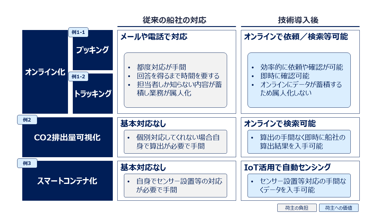 また、船社のデジタル化の恩恵は基本的にすべての荷主が等しく受けられるものですが、実際には「活用しようとするか/どれだけ活用するか」によって荷主間で差が生まれます。先の温度管理の例でも、温度データが入手可能になっても実際にはまったく活用しない企業が多いものですし、活用の仕方も「利用船社が温度データを提供可能であれば活用しよう」とするのか「温度データの提供可否も船社選定時の評価項目に加えよう」とまでするのか等レベル感は様々です。