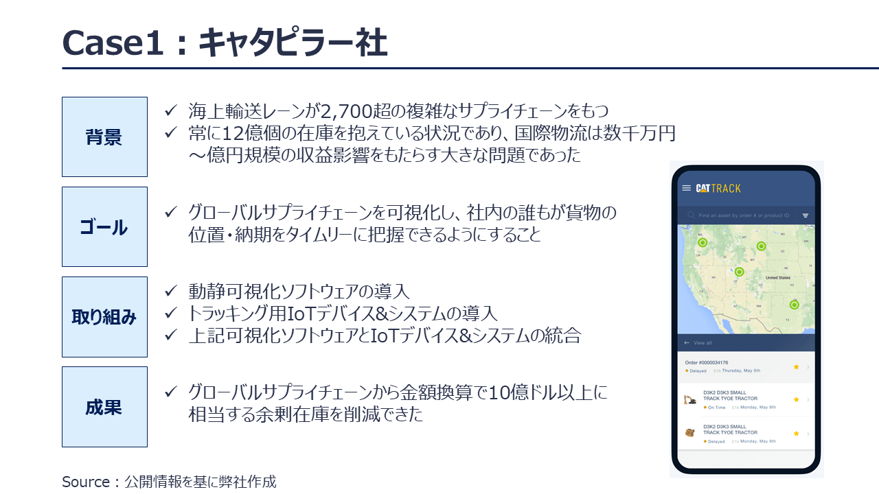建設機械等をグローバルに製造・販売するキャタピラー社は、自社の複雑なグローバルサプライチェーン上の在庫最適化への問題意識からDXに着手し、貨物トラッキングの高度化により、既存事業の収益改善(在庫最適化)に成功しています。