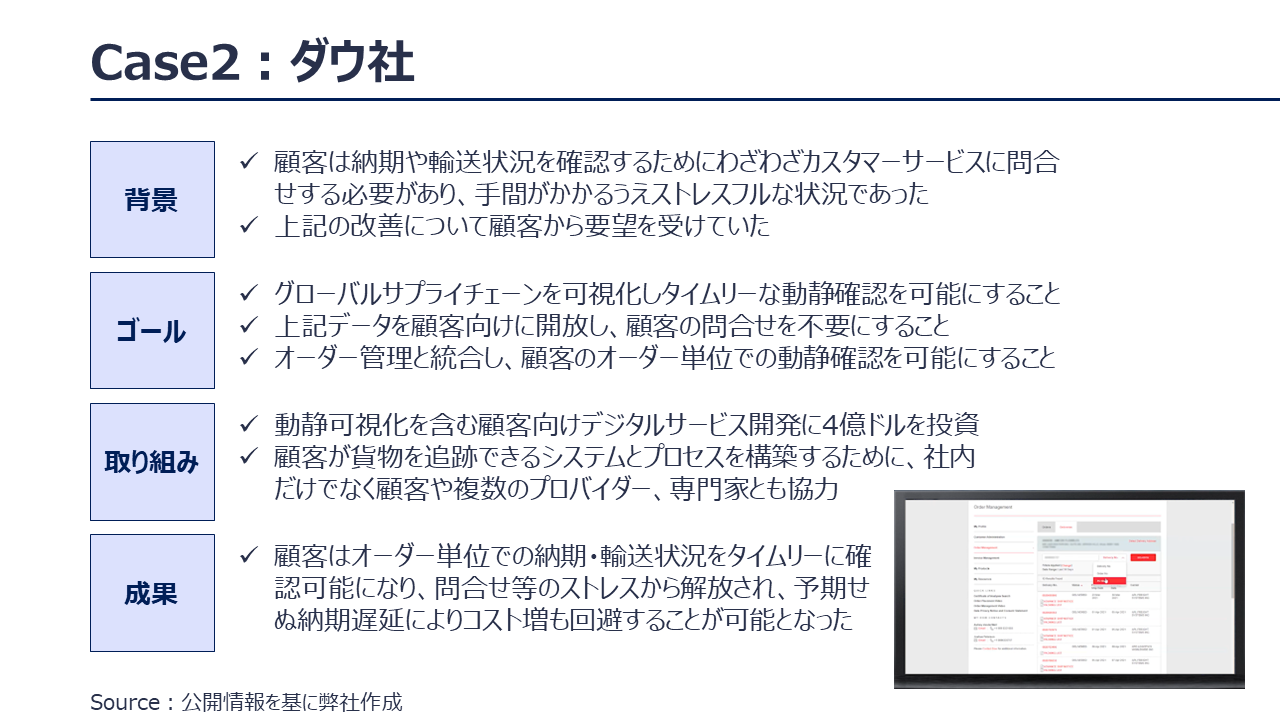 世界的な化学品メーカーであるダウ社は、以前から顧客が納期・輸送状況確認のためにわざわざカスタマーサービスへ問合せする必要がある状況に課題意識をもっており、顧客の可視化ニーズを受けてDXに着手。オーダー管理・貨物トラッキングの高度化と顧客向けウェブサービス開発により、顧客への新たな価値提供に成功しています。
