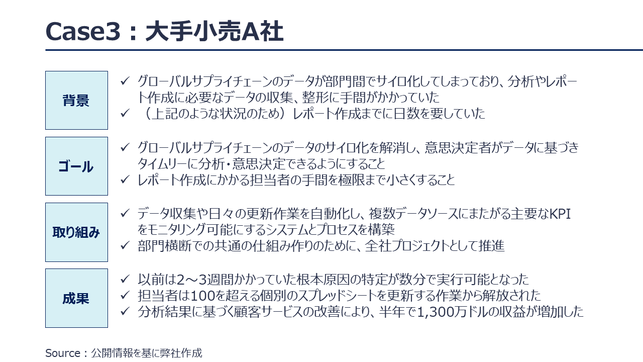 大手小売A社は、部門間でデータがサイロ化(=組織内部でデジタルデータが分散して保管され、有効活用されていない状況)しタイムリーな分析・意思決定が困難な状況への課題意識からDXに着手し、データのサイロ化を防ぎ部門横断的に共通のデータ・KPIをモニタリング可能にすることで、サプライチェーン上の迅速な問題解決やそれによる顧客サービスの改善、社内の業務効率化に成功しています。