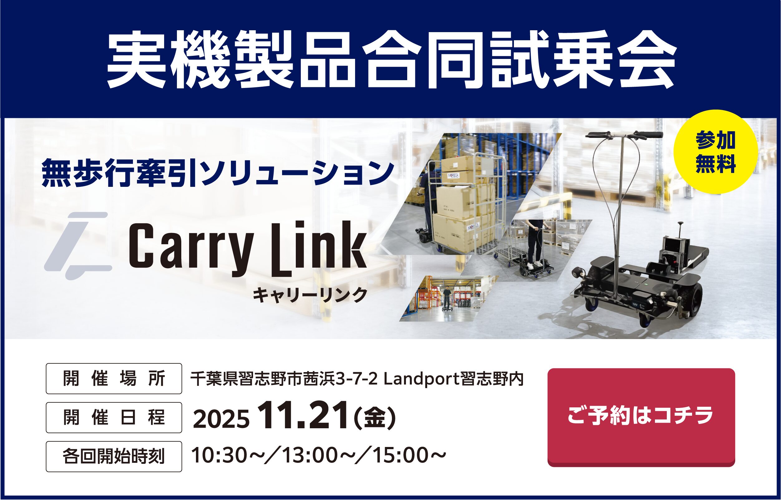 倉庫や工場の搬送業務において、歩行数を最大90%削減する無歩行牽引ソリューションCarryLinkの合同試乗会を行います。