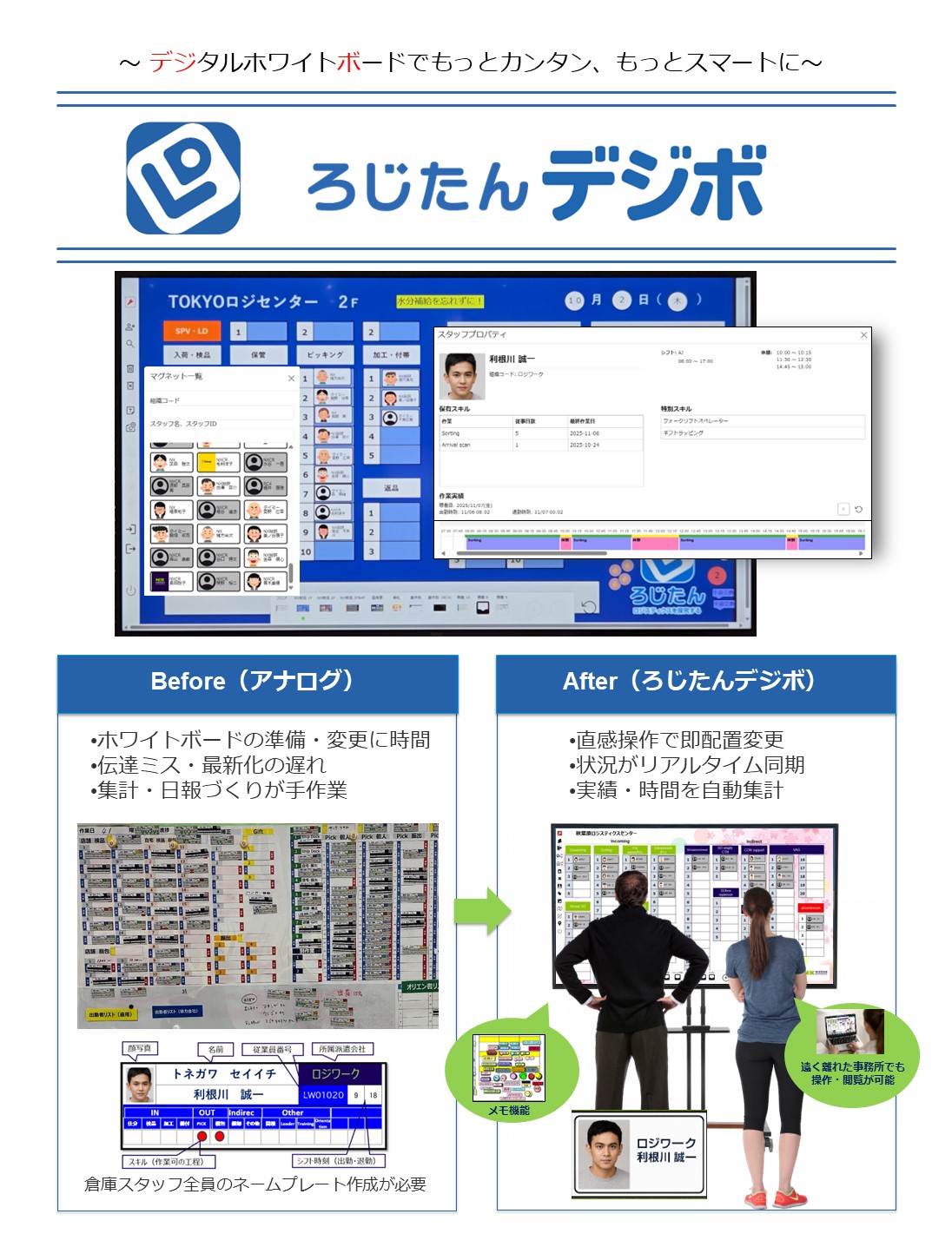 従来のホワイトボードとネームプレートの操作感はそのままに、PC・タブレット・モニターでクラウド上の人員配置・作業管理をリアルタイムに行えるデジタルホワイトボードです。