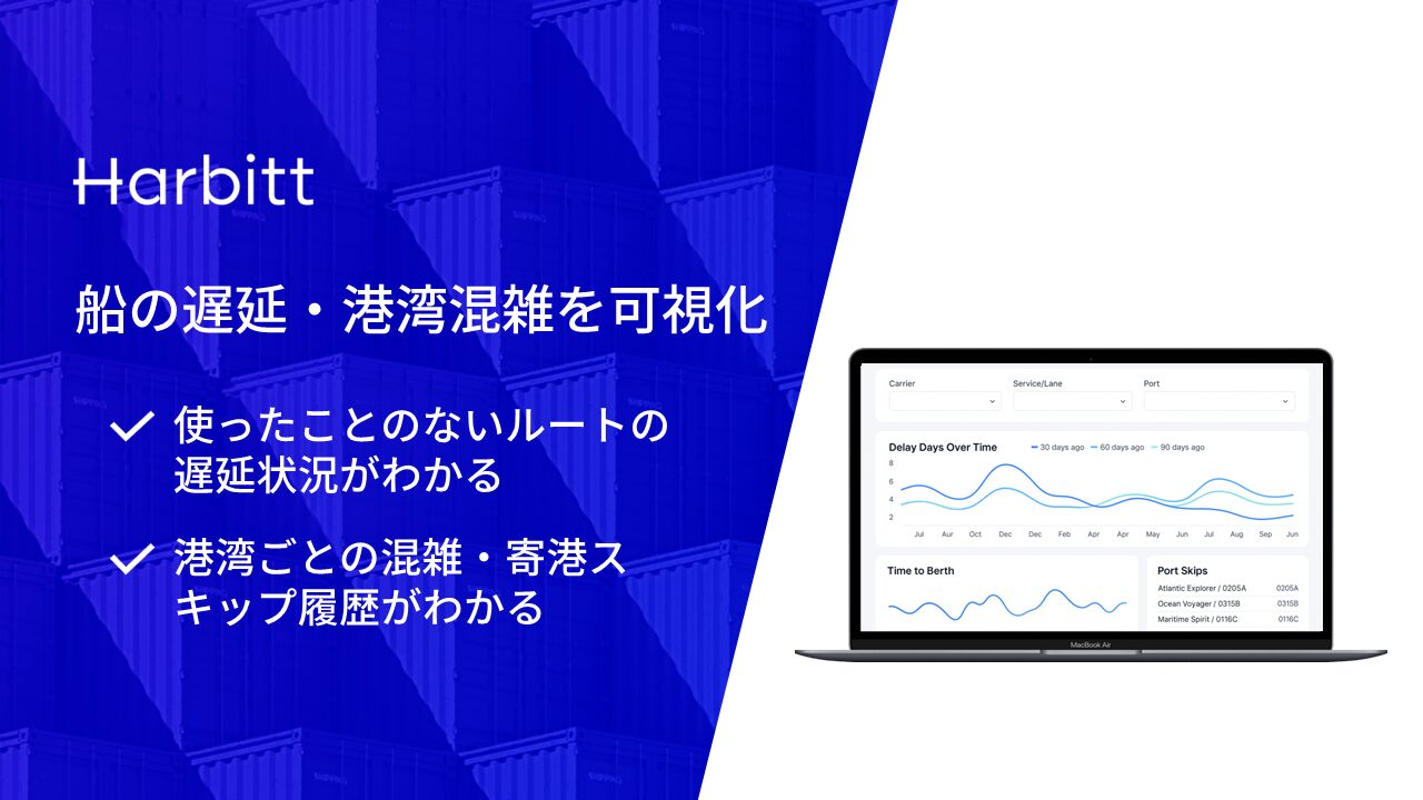 コンテナ船輸送には遅延がつきものです。遅延を回避しようと思って代替ルートを探しても「そっちも遅れていたらどうしよう?」「本当に改善するのだろうか?」で止まってしまっていませんか?ハービットの船の遅延・港湾混雑可視化ツールはこの問題を解消します。
